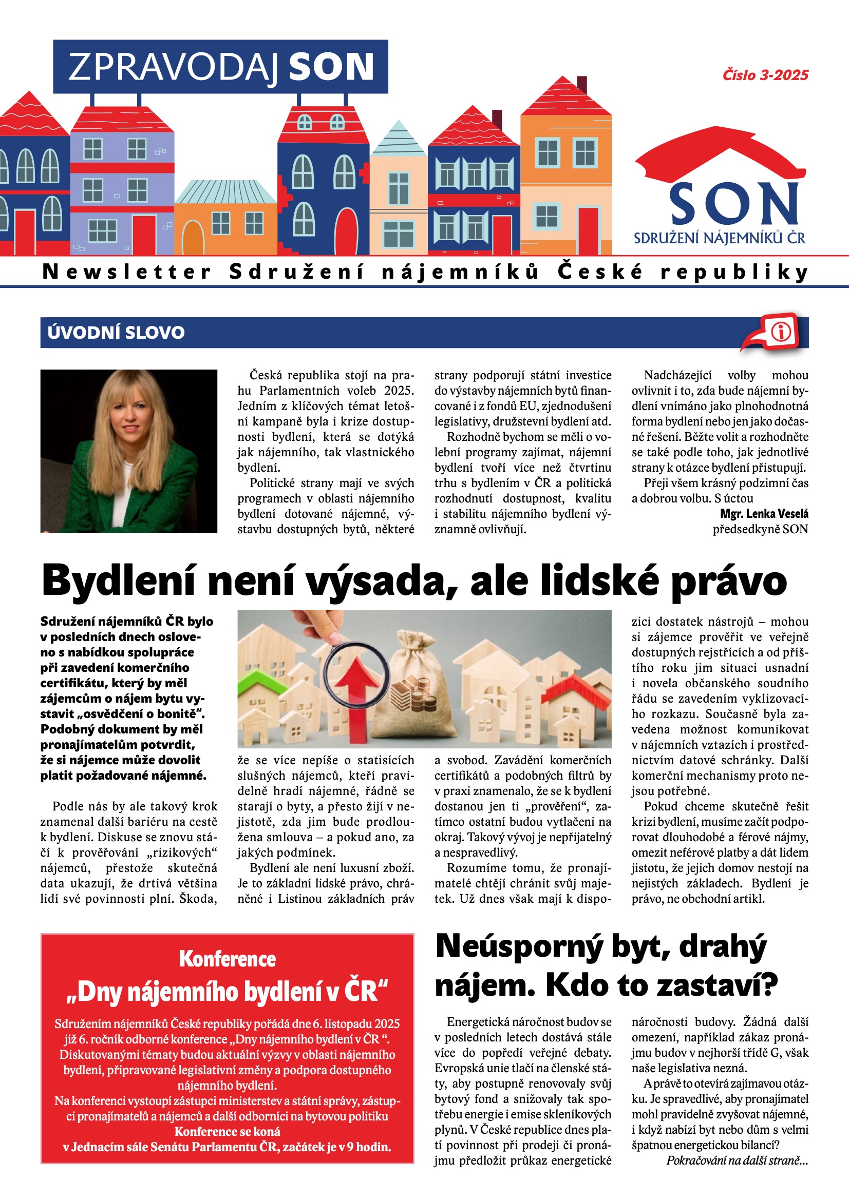 Chcete mít vždy aktuální informace z legislativy a praxe v oblasti nájemního bydlení? Nechejte si posílát náš Zpravodaj SON přímo do vaší schránky. Stačí, když nám zanecháte váš e-mail.